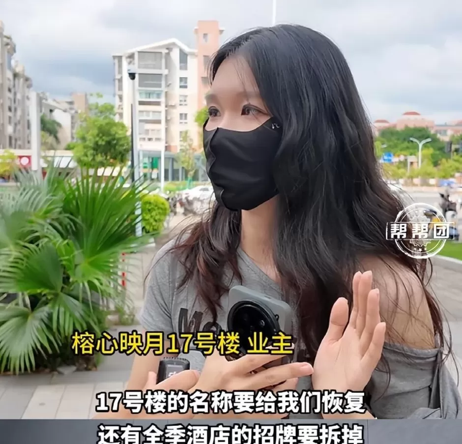 业主们投诉称,今年8月全季酒店对楼栋门面进行翻新工程,原本清晰标注的"榕心映月17幢"入口标识被酒店装修完全遮挡,导致访客和住户频繁迷路,无法顺利找到正确入口。